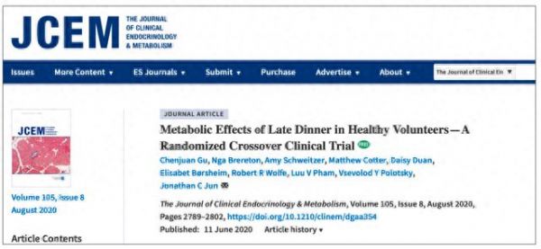 ①Chenjuan Gu,et al.Metabolic Effects of Late Dinner in Healthy Volunteers – A Randomized Crossover Clinical Trial.JCEM.2020.