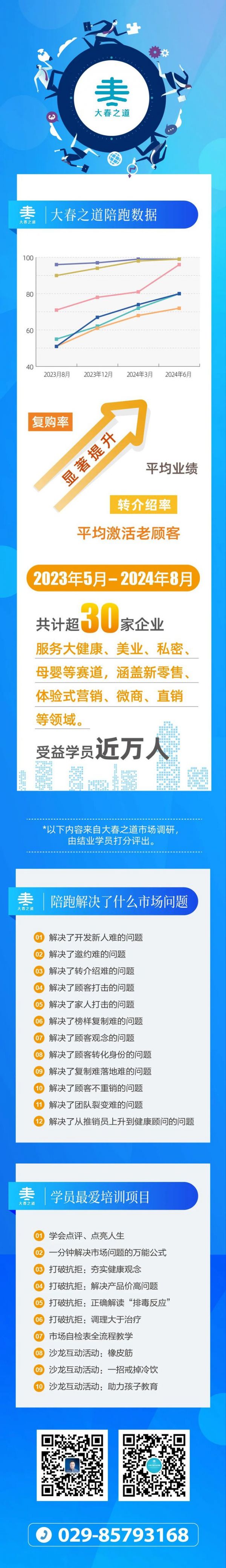 大春之道进一步迭代升级,开启了企业陪跑项目。延续之前的陪跑成绩,企业陪跑依旧取得了让我们震惊的效果,不少市场团队实现了业绩倍增,也因此,大春之道的影响力逐渐扩大。通过这样的方式,我们不断影响着越来越多的人和家庭,希望早日实现“让每个家庭都有一个懂健康的人”的企业使命。