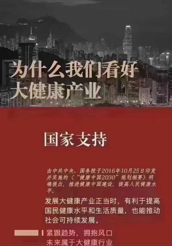 国家政策支持:2016年发布的《“健康中国2030”规划纲要》将健康放在了优先发展的战略地位。政策支持下,健康产业在2030年的总规模预计将达到16万亿元。