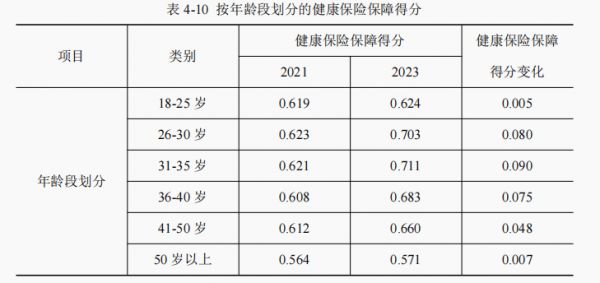 从年龄段划分来看,受访人群中,31—35岁年龄段为健康保险保障情况的最优区间,是“四二一”核心家庭中主要劳动力的年龄分布,也代表家庭主要收入来源的健康保险保障较充分,保险公司或可继续加大特定人群专属健康险产品创新。相较2021年度,各年龄段健康保险保障得分均有所提高,其中26—40岁年龄段提升幅度最大,有利于提高家庭的抗风险能力,降低家庭灾难性医疗支出发生概率。