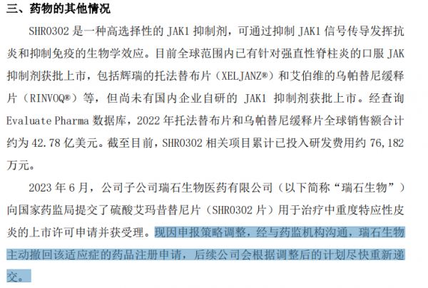 2个月后,根据恒瑞医药8月25日公告,瑞石生物已经撤回了该药治疗中重度特应性皮炎的上市申请,原因是“申报策略调整主动撤回”。