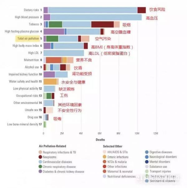 在所有健康风险因素中,空气污染位列第五,排在饮食风险、高血压、吸烟和高空腹血糖之后。每年死于空气污染相关疾病的人数,比死于交通意外或疟疾的人数还要多。
