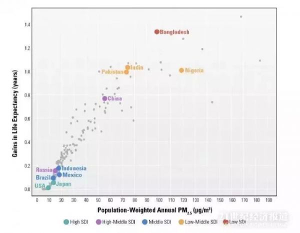 对于那些空气污染严重,而社会人口学指数(SDI)低的国家,消除空气污染对人均预期寿命提升的贡献更大。