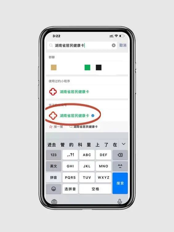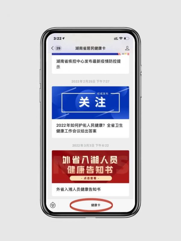 在微信搜索“湖南省居民健康卡”公众号,点击下方健康卡进入健康卡申领页面,尚未申领健康卡的请先申领好健康卡: