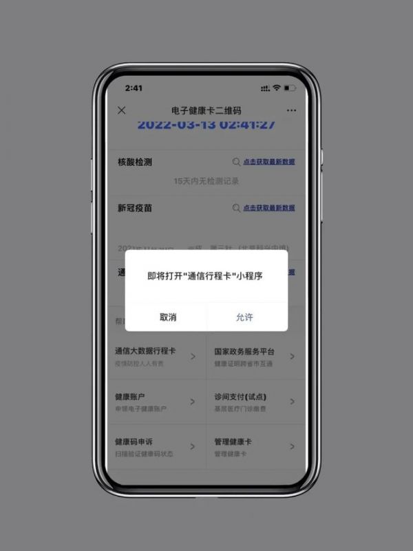 点击进入健康码亮码页面,二维码的下方有通信大数据行程卡的入口,点击进入出现弹框,在弹框中选择允许: