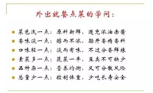 在点菜的时候,商家可能会推荐一些招牌菜,或者价位比较高的菜品。而多肉、多油、多辛辣已经成为很多餐馆菜单上的三大特点,荤菜的品种花色繁多,素菜的比例屈指可数。学会科学合理的搭配,在外进餐时掌握一些点菜的小技巧,避开饮食不合理的“陷阱”,就显得格外重要了。在这我不妨给大家支几招: