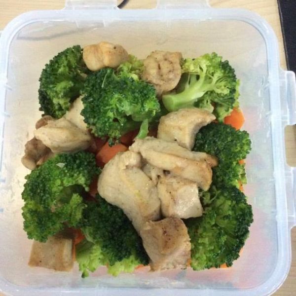 2、午饭吃得新鲜、少油腻,窍门就是蒸饭,我的搭配是150克蔬菜、100克肉类、150克米饭,刚刚好我的一人量。肉类主要是鸡肉,吃得最多,每次都是买4大块鸡胸肉,有2斤左右,切成一厘米见方的肉丁,加15克盐,5克五香粉,一点料酒,一点糖,拌匀,腌一小会儿,然后用保鲜袋分装为100克一袋,冻冰箱里,吃的时候拿一袋,很方便的。