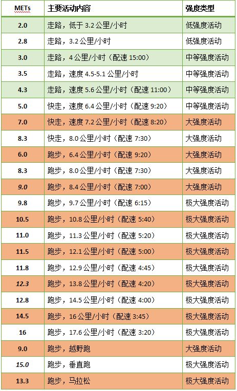 从下表中可以看到,普通步行(4-6公里/小时)属于中等强度活动,快走(7.2公里/小时)已经是大强度活动。