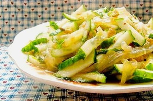 我想这个可能就是对于黄瓜来说最容易的一道菜了,黄瓜购买时一定要选择最新结下的,必要的时候可以削去表皮,不过很多人都是为了把菜做得更加美观,所以大部分的时候绿色的那一层外皮都不愿意去消去,固然这样子的话也是可以的,毕竟黄瓜皮也可以让人使用,我们在洗完之后用刀子把两头切去,然后再把它们按照一定的大小切成条状或者是块状,之后根据客人的口味可以选择堂良多少,喜欢吃甜的话就多放几勺糖,不过要注意的是,如果你是一个特别喜欢吃甜味的,你在饭堂的时候除了撒上一勺之后要先匀一下,然后再撒另一勺,不要一次性撒太多,否则的话会把甜味到一个黄瓜条里面这样子的话,后期吃起来甜的味道就非常不均匀。