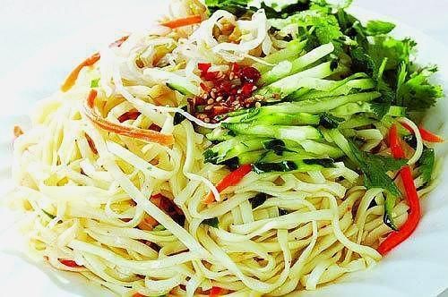 面条煮好以后除了搭配上自己所炒的一些其他的菜以外已配上黄瓜,把黄瓜切成丝状,与面条搅拌一下,或者是专门准备一个榨汁机,把黄瓜榨碎出来的汁浇在面条之上,然后多搅拌几下。这样子的话不论是你配什么样的炒菜,即便全部都是重口味的,面条都吃起来会非常的清爽可口。