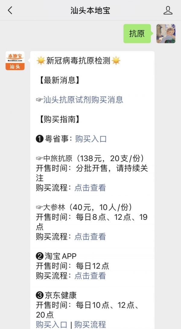 温馨提示:微信搜索公众号【汕头本地宝】,关注后在对话框回复【抗原】获取汕头抗原检测试剂盒购买入口、购买渠道、使用指南、结果查看和上报等。