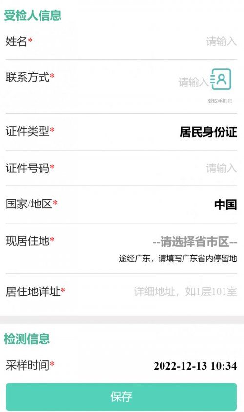 4、填写受检人信息和检测信息,点击保存。