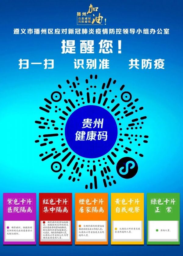 “贵州健康码”已于近日上线,用于对重点对象进行快速甄别,对疫情严重地区以及高风险地区流入人员加强跟踪管理,提高防控效率,切断疾病传播途径,进一步推动疫情期间我省复工复产和社会面有序流动,切实保障人民群众生命安全和身体健康。
