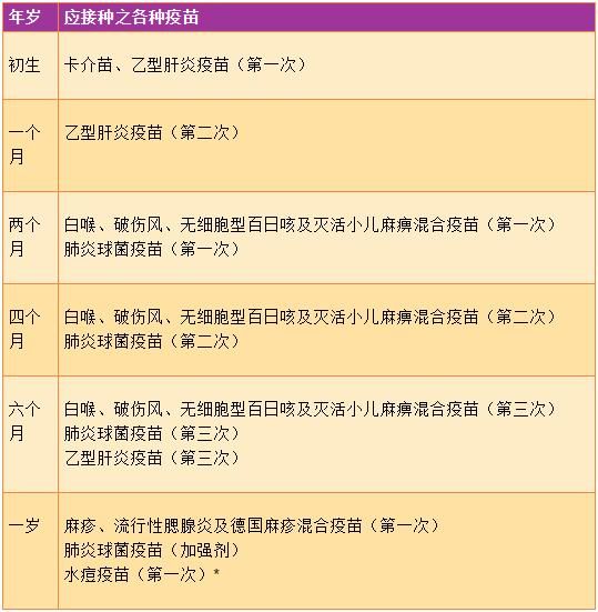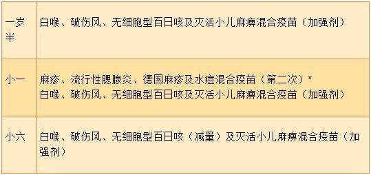 *水痘疫苗已纳入于2013年1月1日或以后出生儿童之计划内,而麻疹、流行性腮腺炎及德国麻疹混合疫苗将会继续提供给在此日期之前出生的小学一年级儿童。