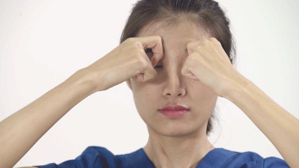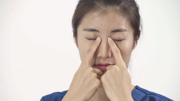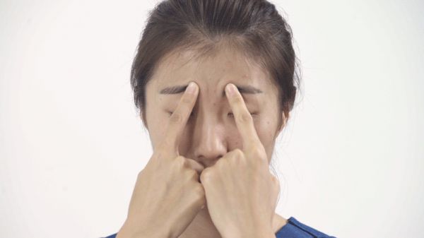 攒竹穴位于两眉头起始端,双手指腹以打圈的方式由外向内进行按揉,按揉的力度应适中;