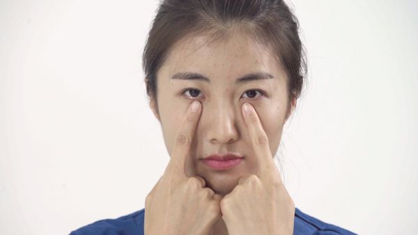 睛明穴位于鼻根与内眼角处,双手指腹以打圈的方式由外向内分别按揉双侧睛明穴,按揉时注意力度适中;