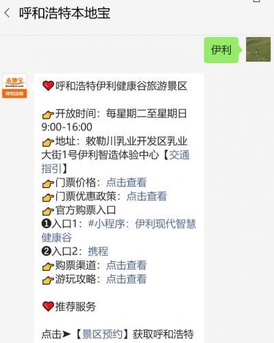 温馨提示:微信搜索公众号【呼和浩特本地宝】,关注后回复【伊利】可获呼和浩特伊利健康谷官方购票入口,查看门票价格/优惠政策,开放时间、地址及交通指引、游玩攻略、咨询电话等!
