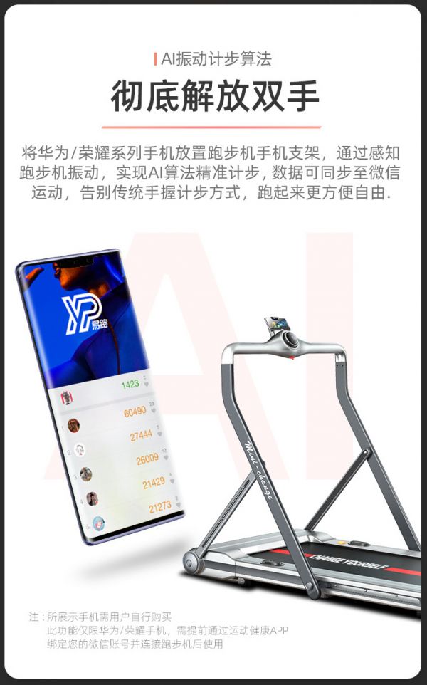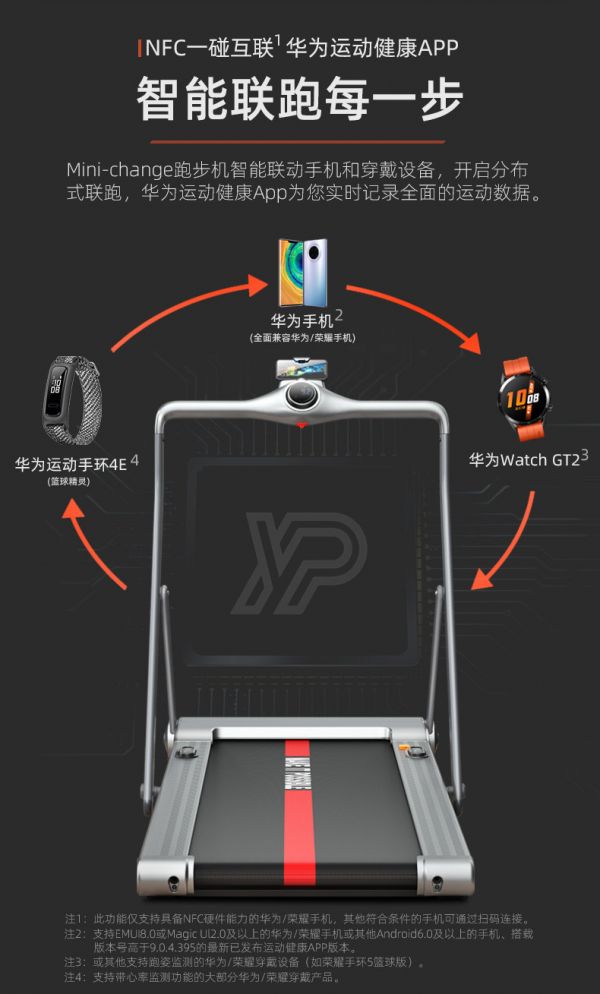 MINI-CHANGE华为运动健康生态款,只需将手机的NFC区域轻触跑步机感应区,就能实现秒联,智慧跳转到手机跑步机运动界面。