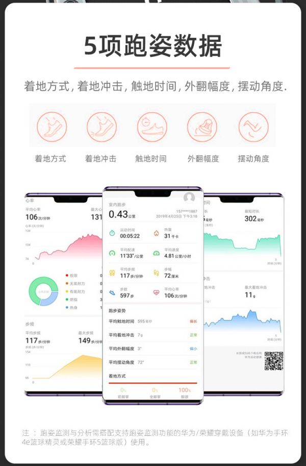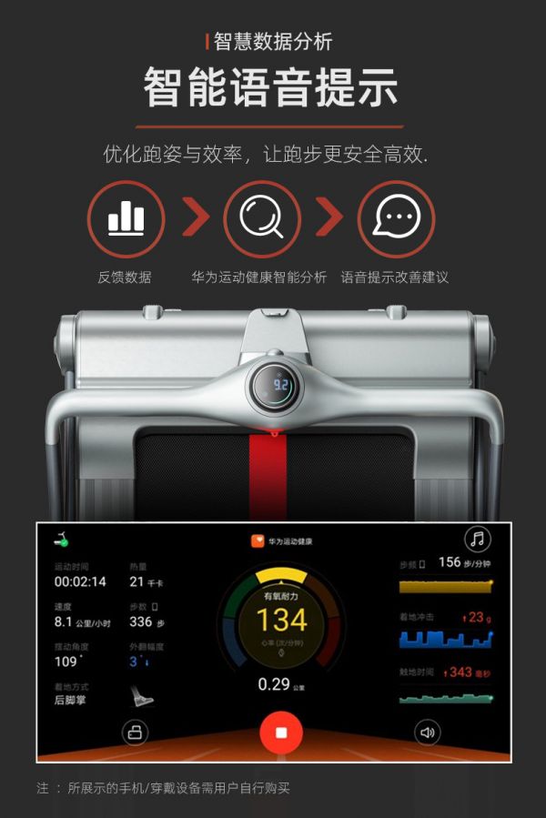 通过华为手机、(华为支持心率监测和跑步姿势识别的)穿戴设备反馈运动数据,华为运动健康智能分析运动情况,给出合理建议,实时语音温馨提醒。