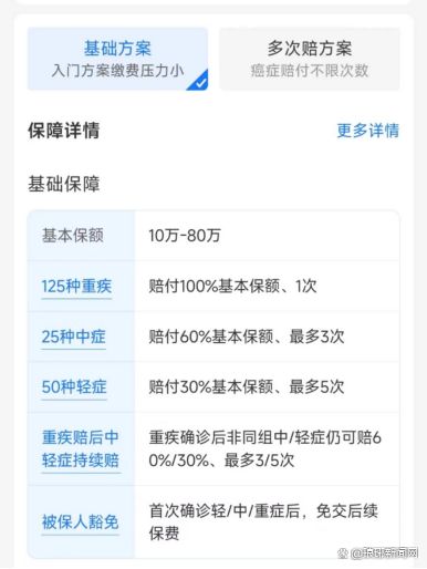 其中重疾部分赔付100%保额,中症赔付60%保额,且保障期内最多可以赔付3次,轻症30%保额,保障期内最多可赔付5次;