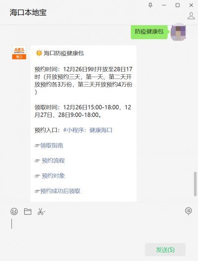 温馨提示:微信搜索公众号【海口本地宝】,关注后在对话框回复【防疫健康包】可获海口防疫健康包预约入口、时间及流程、领取地点、老人防疫包等。