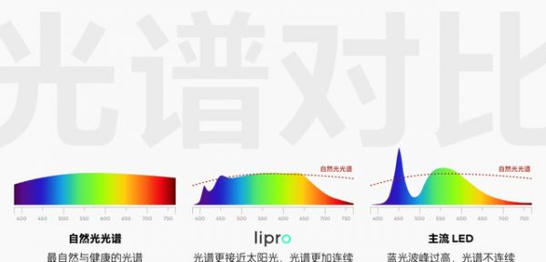 虽然此前常见的白炽灯中的蓝光含量极少,但是因为能效低寿命短的原因,已经逐渐被含有蓝光的LED芯片的节能灯所取代。而魅族推出的Lipro健康照明系列全都采用了如然之光,其拥有高色显、自然光谱、低蓝光、无可见频闪等。最值得一提的是,该系列的自然光谱是最接近太阳光的,光谱更加连续。从下面这张对比图来看,主流的LED灯蓝光波峰过高,光谱也并不连续,会造成频闪,对眼睛也有很大的伤害。由此可见,Lipro健康照明系列的灯光要更接近自然、健康。