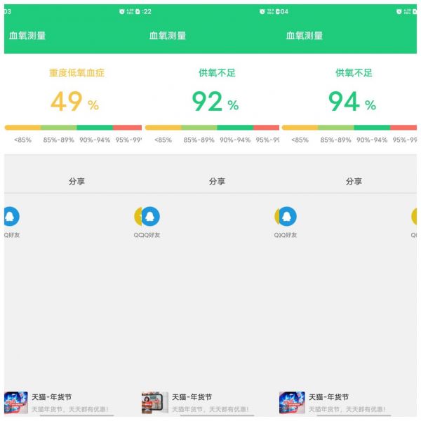 最后一款App是体检视力测试,先说明,这款App不限次免费测试,但必须向其他人分享一次才能解锁该功能。经过测试,这款App的结果把我整懵了,我连续测了几次,最多的数据是血氧饱和度92%,最高的一次是94%,最离谱的一次居然测出了49%的数据。