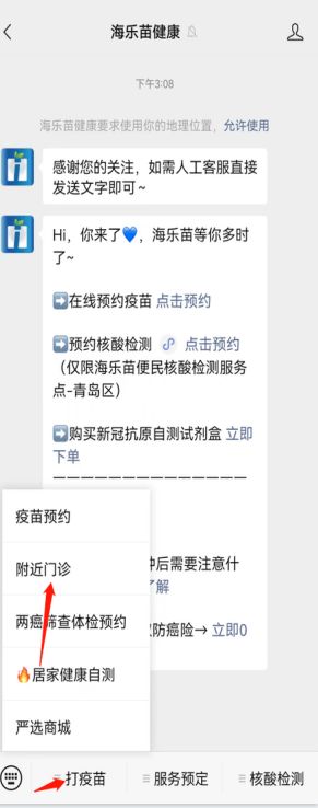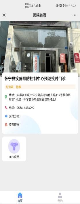 2、进入公众号点击左下菜单栏“打疫苗-附近门诊”,在怀宁县疾控中心预防接种门诊选择要预约的HPV疫苗。