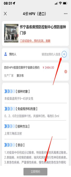 3、先添加预约人信息,再点击立即预约;进入预约界面,选择第一剂次、预约时间后再点击立即预约并提交。预约成功,会收到预约成功微信通知。