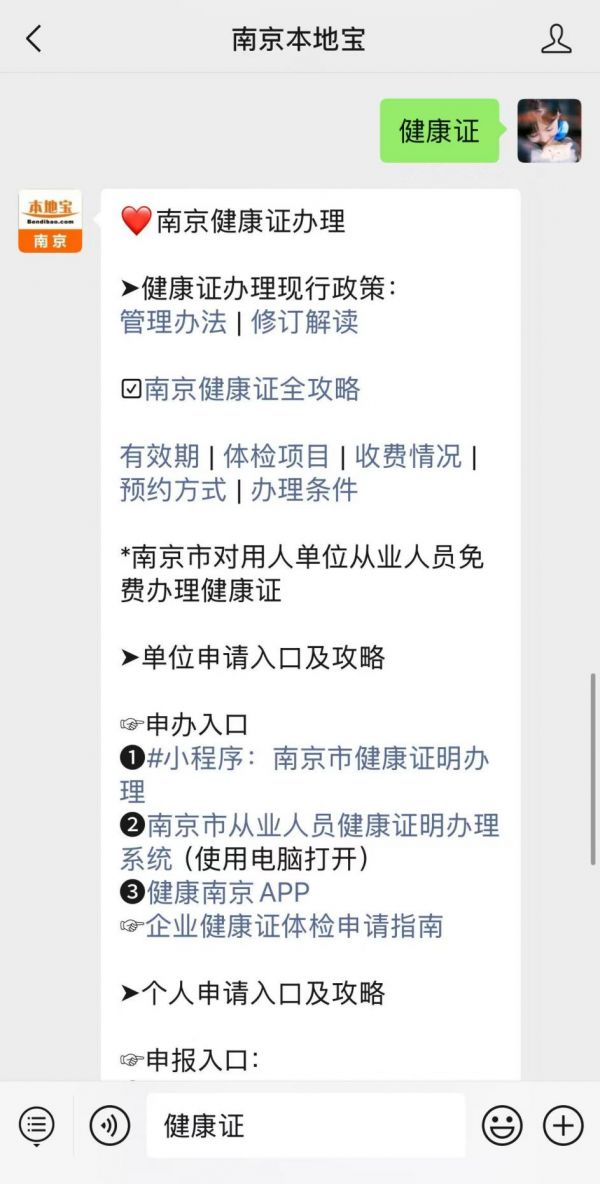 温馨提示:微信搜索公众号【南京本地宝】,关注后在对话框回复【健康证】获健康证办理先行政策解读、健康证办理地点/有效期/体检项目/收费情况/预约方式/办理条件、单位申请入口及攻略、个人申请入口及攻略 、电子健康证查询指南等信息。