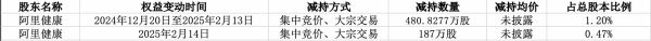 时代周报记者统计,截至2月17日,阿里健康已合计减持约667.83万股,其持有公司2337.1096万股,占总股本的比例为5.84%。