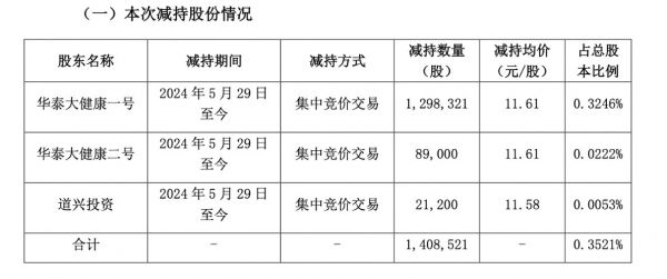 华泰大健康一号、华泰大健康二号执行事务合伙人均为华泰紫金投资有限责任公司,道兴投资属于跟投平台,三者具有关联关系,持有股份合并计算(三者以下合称“华泰大健康”)。华泰大健康合计持有公司22,720,296股,占公司总股本的比例为5.6799%。