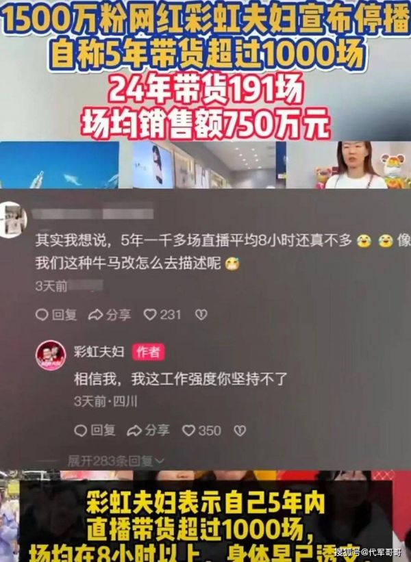 在这种大环境下,彩虹夫妇选择停播,不失为一种 “人间清醒” 的体现。他们没有被眼前利益冲昏头脑,而是勇敢停下脚步,直面自身身体和家庭面临的问题。他们深知,身体是奋斗的基础,没了健康,一切都将化为泡影。