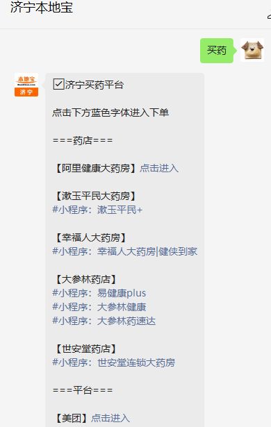 温馨提示:微信搜索公众号【济宁本地宝】,关注后在对话框回复【买药】可获济宁各药房防疫药品最新消息,线上平台买药入口、买药送到家渠道、24小时门店等