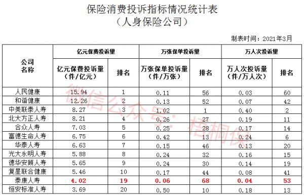 泰康人寿作为老七家公司之一,实力雄厚。从消费者投诉统计数据排行榜单来看,泰康人寿的一项排名稍靠前,说明投诉不少,不过整体投诉情况还是较少,具体如下: