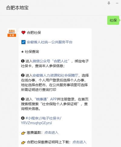 温馨提示:微信搜索公众号合肥本地宝,关注后在聊天对话框回复【社保】获取合肥社保查询+办事入口,及缴费证明下载,灵活就业人员参保指南,合肥社保基数等信息。