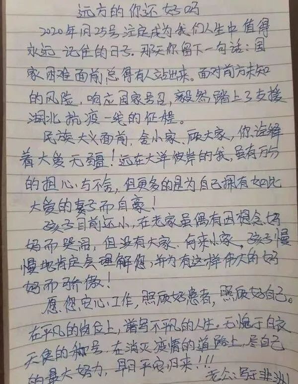 丈夫在信中说,为妻子舍小家,为大家的大爱而自豪。虽然孩子目前还小,时常因为想念妈妈哭闹,但将来会为有这样伟大的妈妈而骄傲。最后丈夫嘱托妻子照顾好自己,早日平安归来。