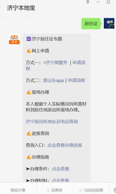 温馨提示:微信搜索并关注【济宁本地宝】微信公众号,发送【居住证】可获取济宁居住证申请入口(网址/app)、现场办理地点/电话、办理条件/流程/材料、签注换发、进度查询、入学积分计算、优惠政策等