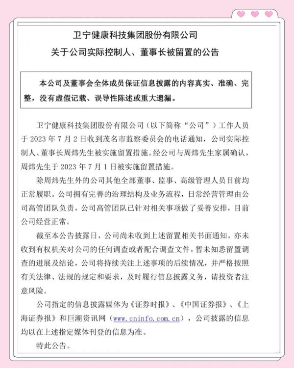 卫宁健康科技集团股份有限公司(以下简称“公司”)于2023年7月2日收到茂名市监察委员会的通知,公司实际控制人、董事长周炜先生被采取了留置措施。公司已与周炜先生的家属确认,周炜先生于2023年7月1日起被留置。