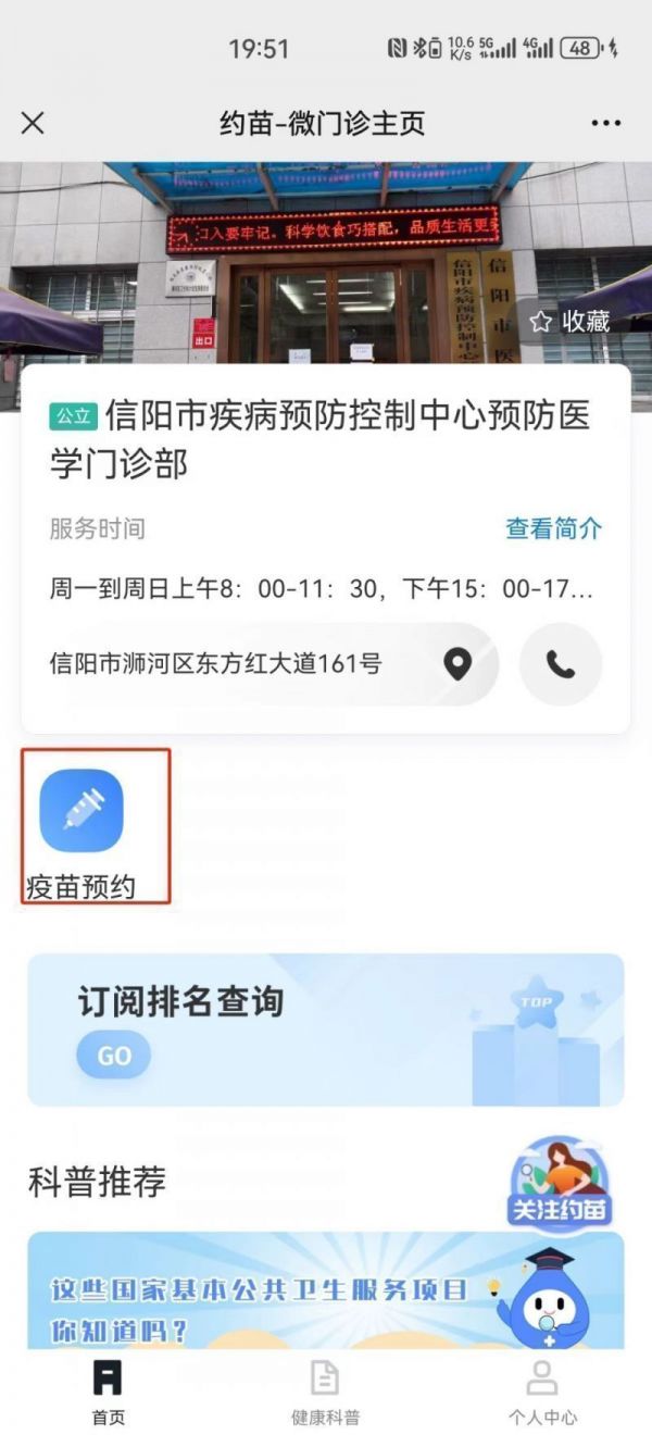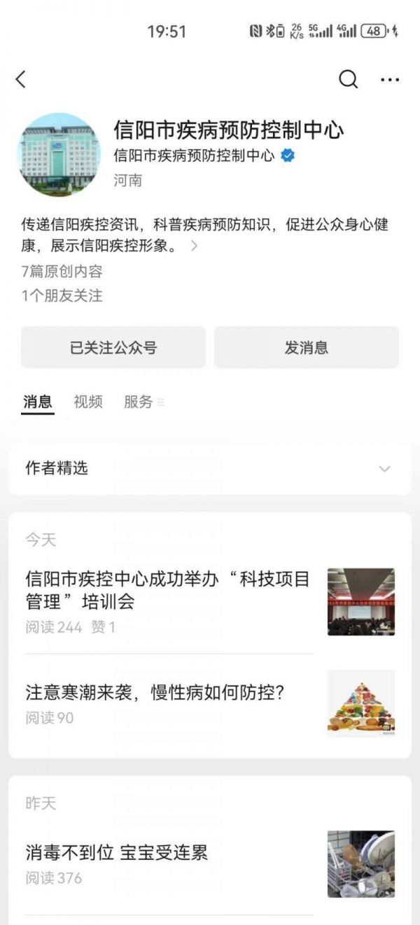 第一步:关注微信公众号”信阳市疾病预防控制中心“