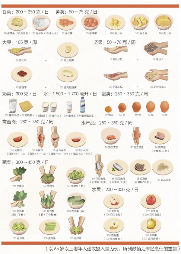 ⑤老年人每天足量饮水对维持代谢也非常重要,水推荐量为每日30毫升/千克体重。