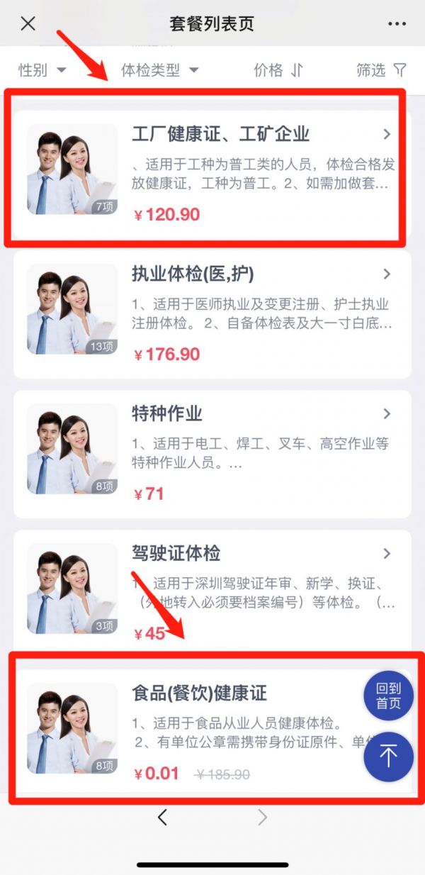 关注“深圳市龙岗第三人民医院”公众号→点击医疗服务→点击体检预约→点击个人体检→选择工厂健康证、食品(餐饮)健康证、公共场所健康证即可预约