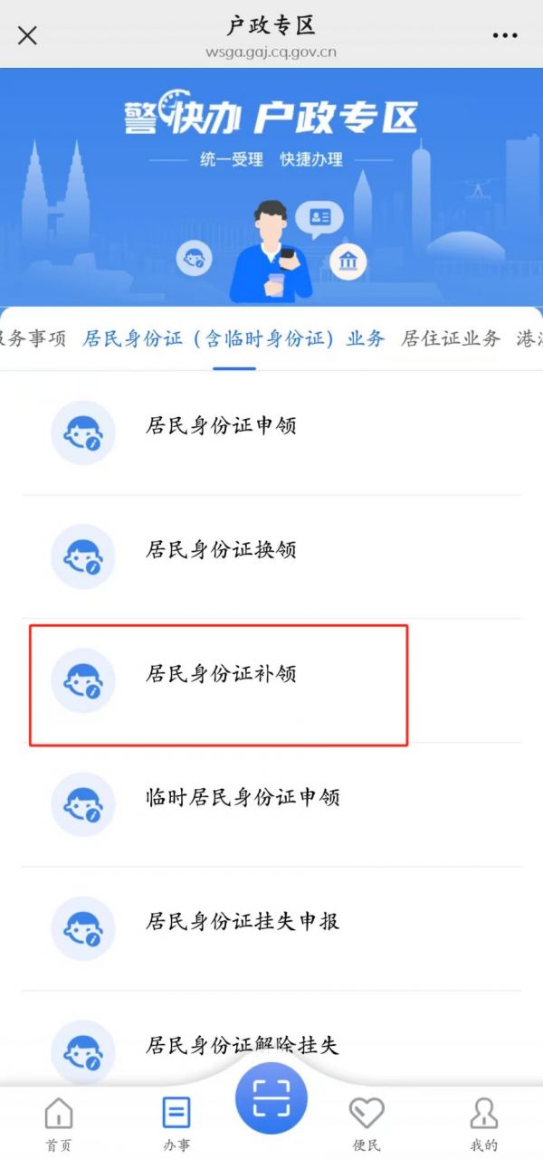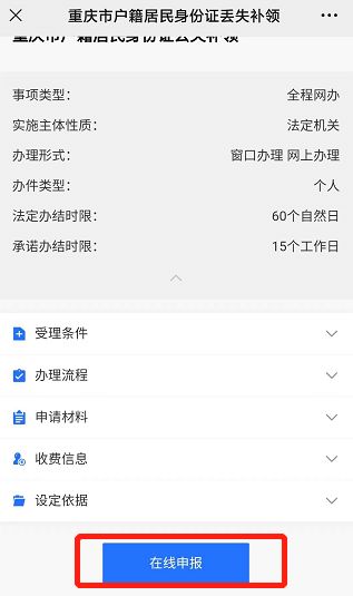 方法一:直接点此进入重庆市户籍居民身份证丢失补领办事事项。