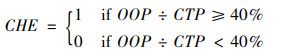 本研究关注被解释变量为家庭是否发生灾难性卫生支出以及灾难性卫生支出的强度。基于WHO计算标准,当家庭的自费医疗支出(out-of-pocket health payments,OOP) 占家庭可支付能力(capacity to pay,CTP)的比例超过40%时,就认为发生了灾难性卫生支出(Catastrophic health expenditure, CHE)[2],具体计算公式如下: