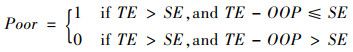 (2)当家庭消费总支出(Total Expenditure, TE)减去家庭医疗支出OOP后,若低于或等于家庭生存支出(Surviual Exponditure, SE)时,则认为因为卫生支出导致家庭主要开支不足以或刚好维持家庭基本生存性支出,即发生因病致贫(poor),具体计算公式如下: