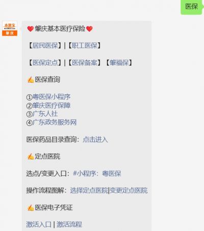温馨提示:微信搜索公众号【肇庆本地宝】,关注后在对话框回复【医保】可获肇庆医保缴费入口、医保药品目录查询、定点医院选点入口、各区县医保局电话等