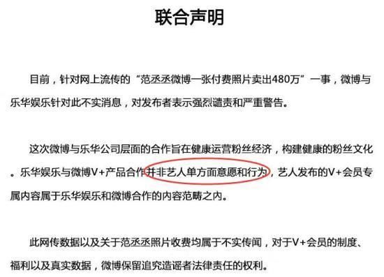 声明提到,乐华娱乐和微博合作旨在健康运营粉丝经济,构建健康的粉丝文化,并非艺人单方面意愿和行为,艺人发布的内容也是合作内容范畴之内。