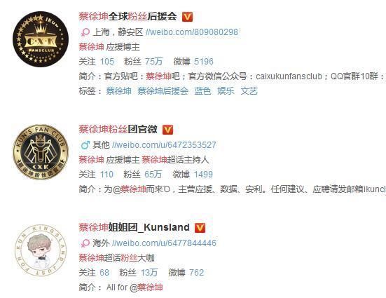 以《偶像练习生》里人气最高的蔡徐坤为例,网上有不少为其成立的粉丝组织。