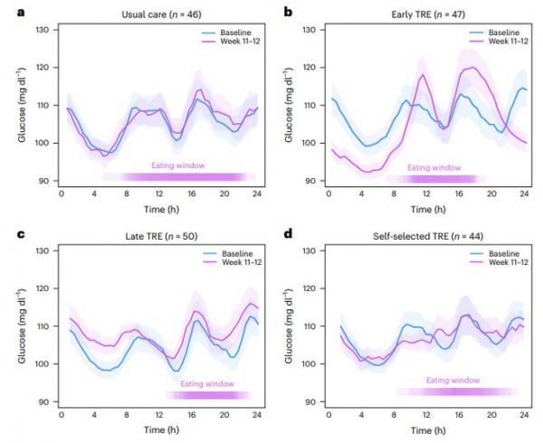 进一步分析发现,与其他组相比,早禁食模式的空腹血糖水平、夜间平均血糖水平显著改善。