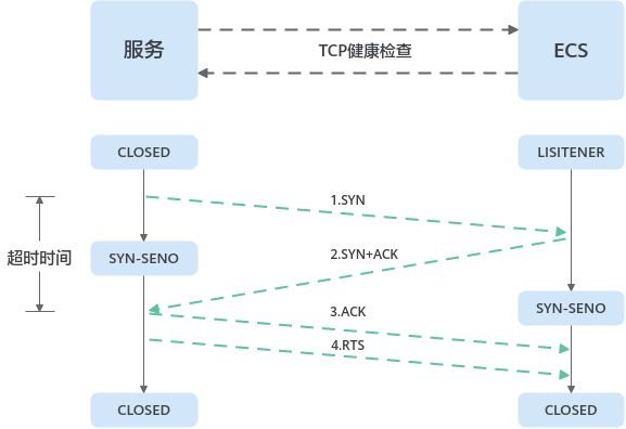 TCP健康检查对于四层(TCP)和七层(HTTP/HTTPS)后端协议,您可以配置TCP健康检查,通过发起TCP三次握手来获取后端服务器的状态信息,如图1所示。